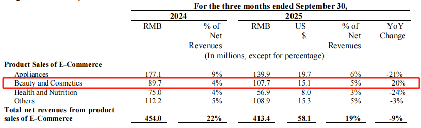 具体来看,第三季度,在服务模式可持续增长的推动下,电商板块营收同比增长2%至18亿元。其中,产品销售额下降8.9%至4.13亿元。按销售产品来看,美妆护肤类销售额达1.08亿元,同比大涨20%,是唯一增长品类;其家电、健康与营养品分别大跌21%、24%。